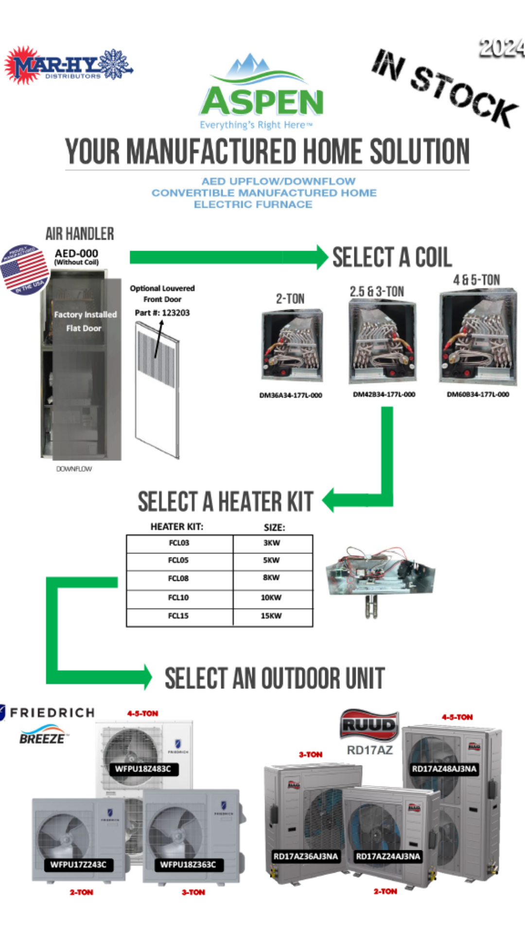 Welcome to the future of HVAC solutions for manufactured homes with the Aspen AED Air Handler. This innovative indoor unit is designed to deliver unmatched flexibility and efficiency, providing multiple tonnages in a single unit. Whether you’re an HVAC installer or a professional looking to elevate your offerings, the Aspen AED is the ideal choice for superior heating and cooling solutions.