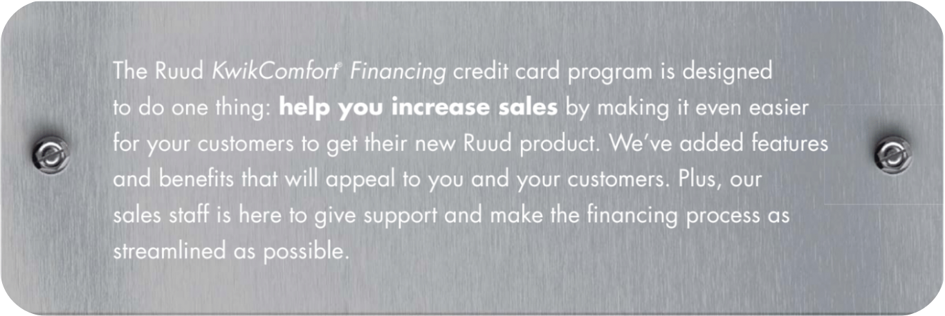 By offering the Ruud KwikComfort® Financing credit card program, you can provide a variety of financing options to your customers. This program helps your customers get the Ruud home system they need with a convenient monthly payment plan that fits their budget.